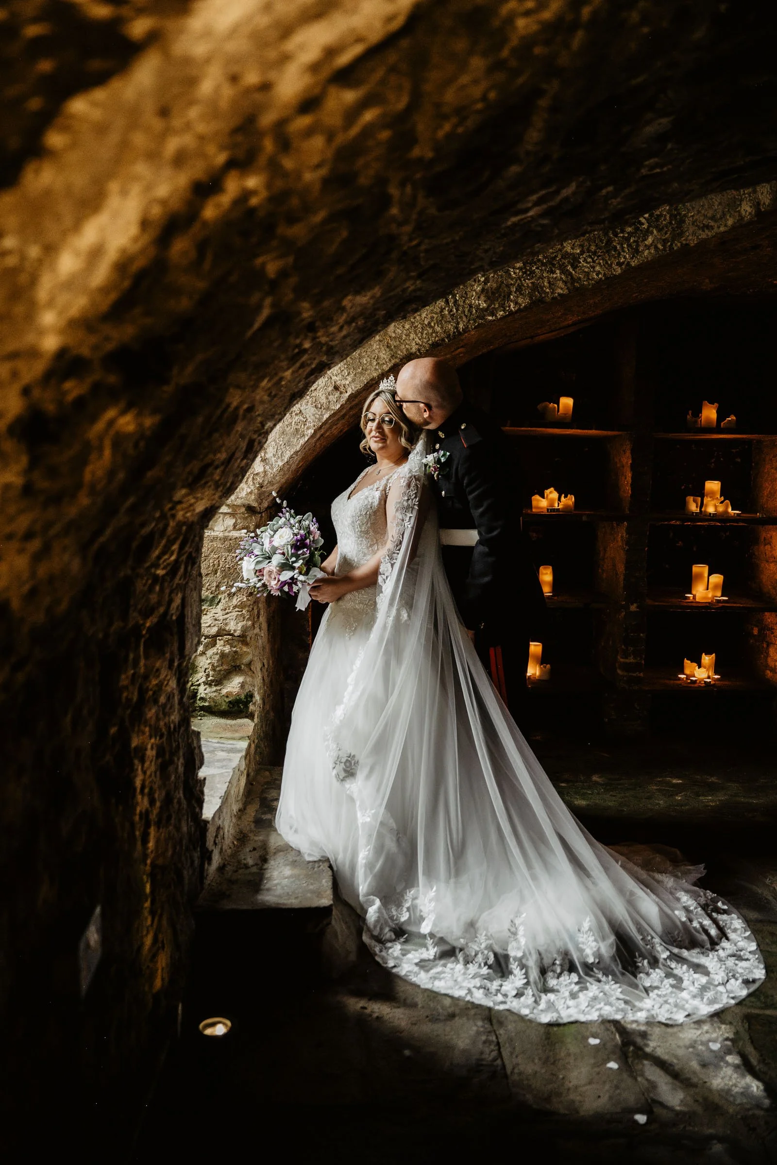 Walworth Castle has its own dungeon and if you have never considered using it for your wedding portraits, allow Amy and Dan's photographs to change your mind entirely. The combination of ancient stone walls, dramatic low light, and a military groom alongside his bride in a tiara and veil created some of the most atmospheric and striking portraits I have ever had the pleasure of capturing.