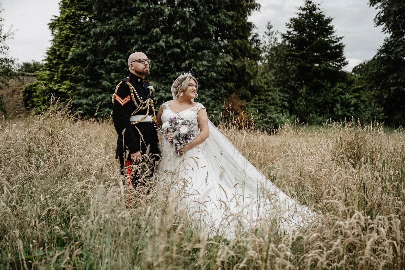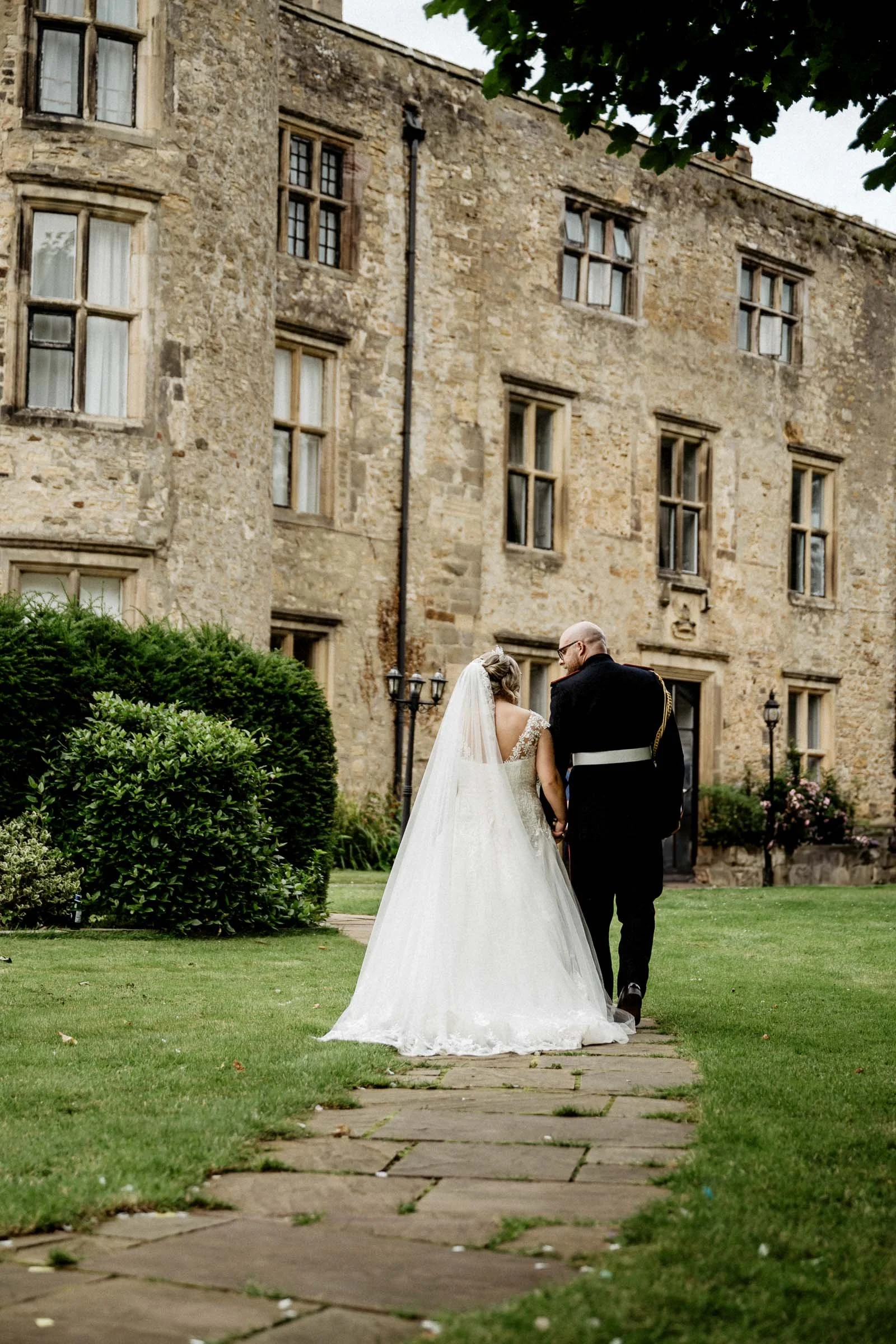 A military groom in full dress uniform. A bride in a stunning gown with a tiara and flowing veil. Navy bridesmaids. An outdoor ceremony in the castle grounds. And — more on this shortly — portraits in Walworth Castle's legendary dungeon. If you are looking for a wedding day with drama, romance and atmosphere in equal measure, this was it.